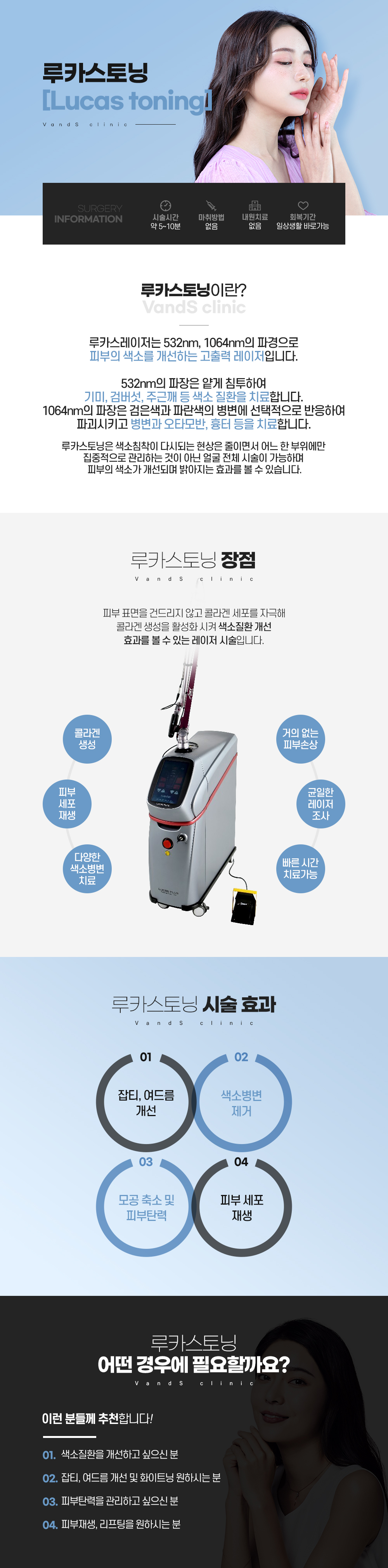 색소병변에 높은 피크파워 에너지를 15hz의 순간적인 빠른 방출로 색소만을 선택적으로 파괴하는 레이저토닝장비입니다.